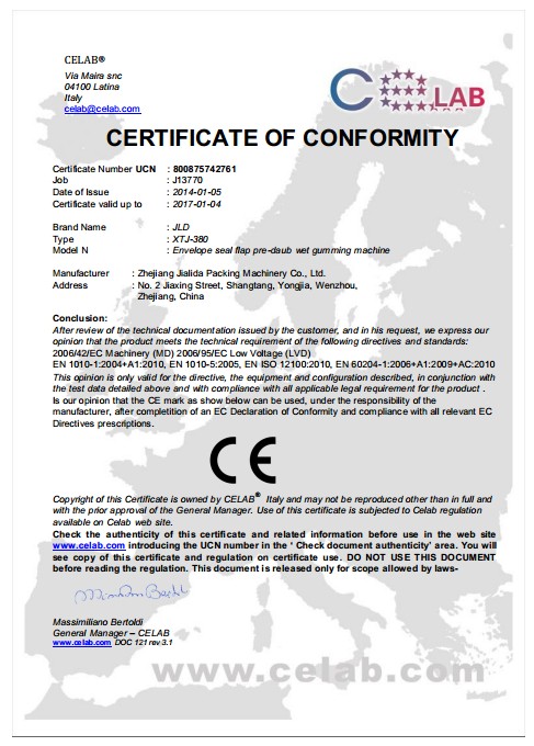 2014年1月XTJ-380信封涂膠通歐盟CE認(rèn)證