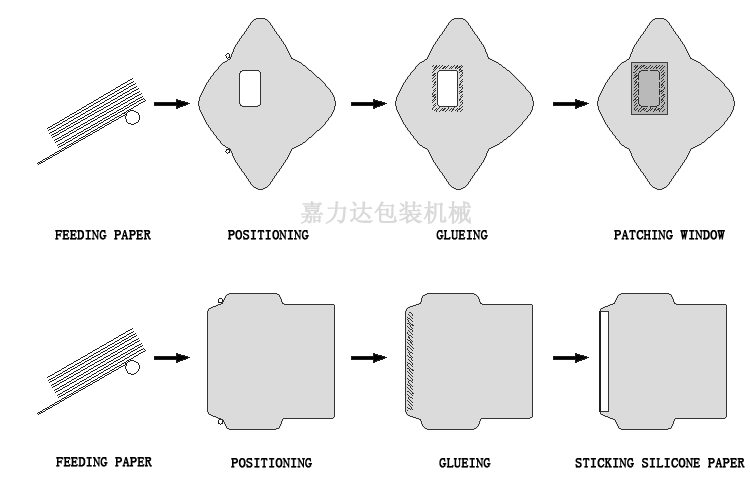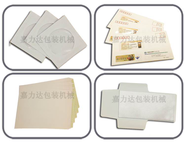 The machine is suitable for sticking silicone paper or film on envelope. It can feed paper, locate the paper, daub pressure sensitive adhesive, cut silicone paper or film which length can be adjusted by the stepless variator.